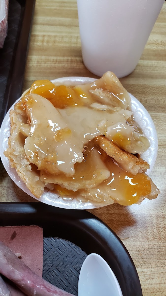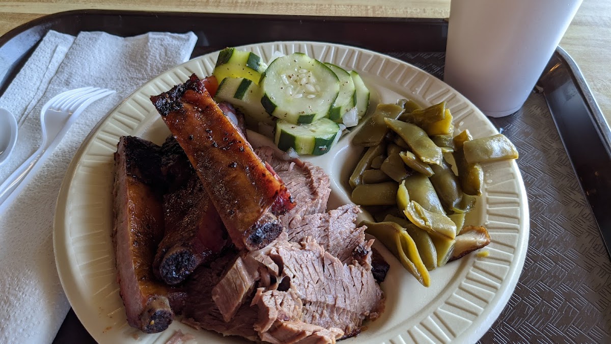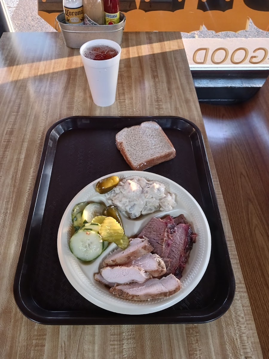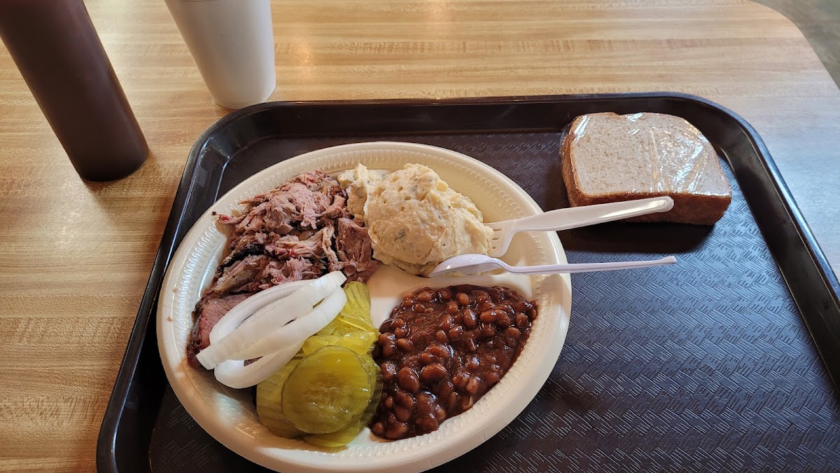 Stopped for lunch and got the 2 meat dinner plate. It’s a little pricey, but the food is good. Brisket is perfectly smoky and juicy. Delicious ribs are perfectly smoked. Potato salad is more like loaded mashed potatoes, but is very tasty. Great food and good service!